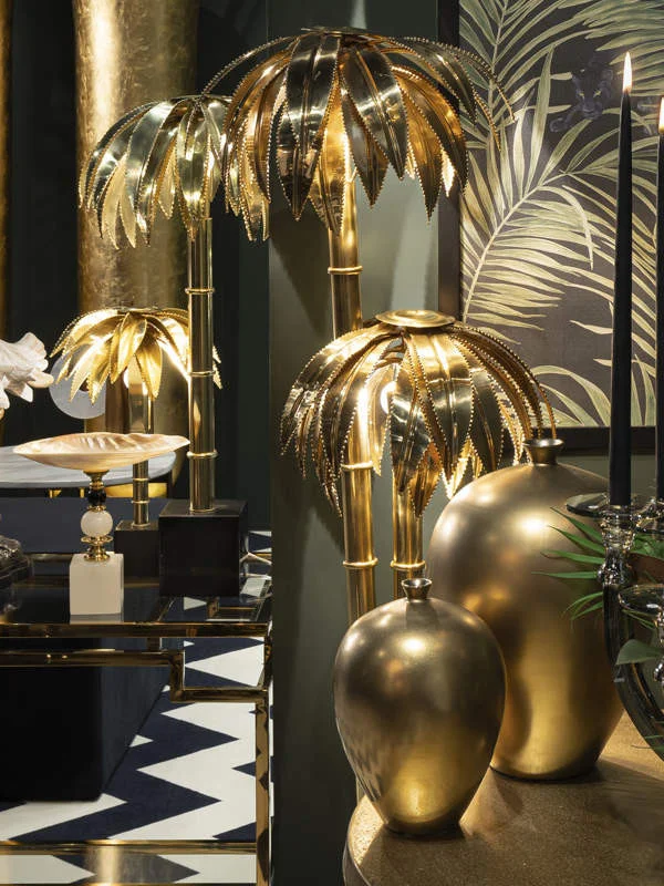 Altın dokudaki palmiye formu, mekâna sıcak, egzotik ve sofistike bir atmosfer kazandırırken; kaliteli abajur yapısı yumuşak, davetkâr bir ışık yayar.