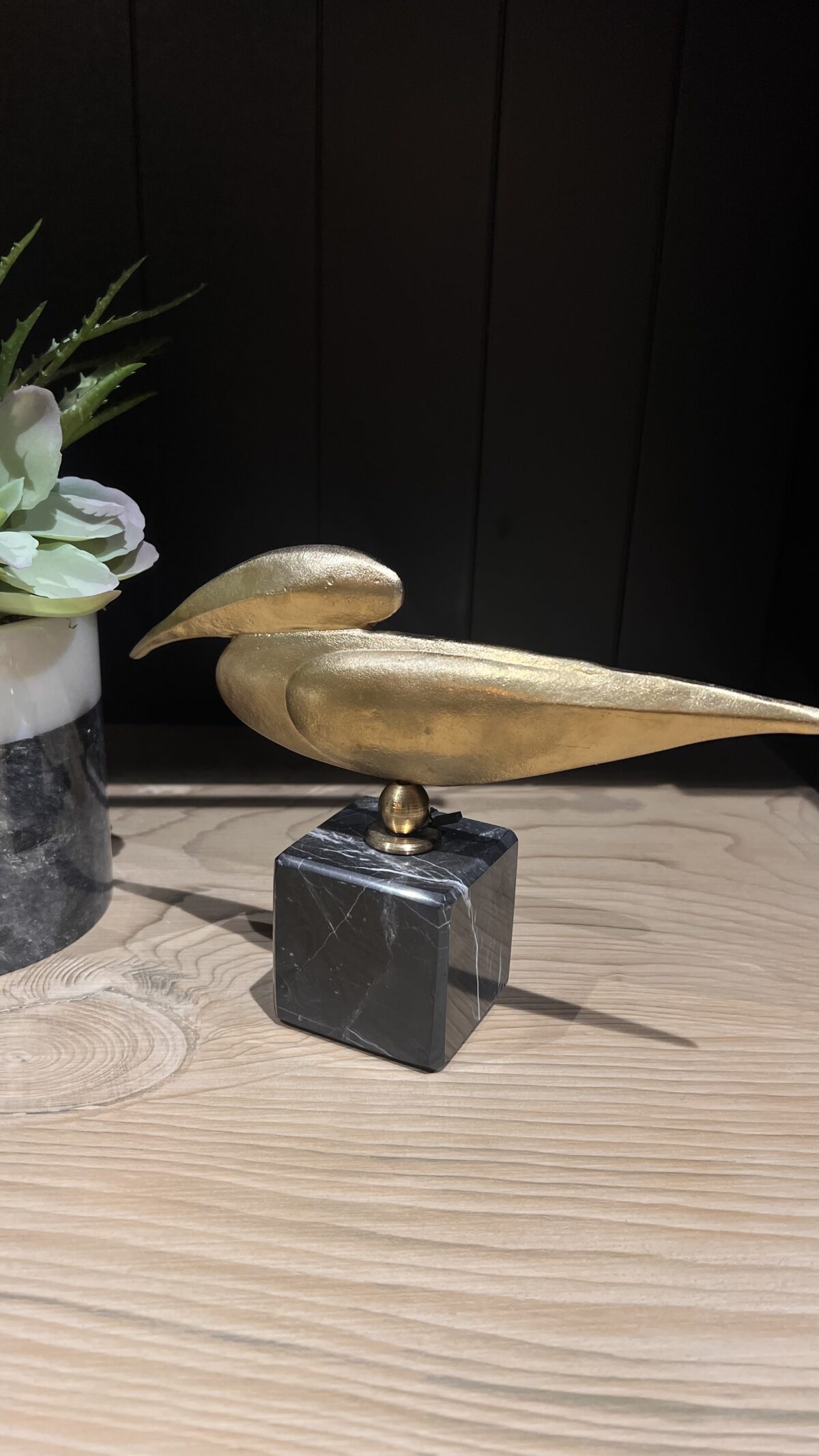 Zarafeti ve sadeliği bir araya getiren gold ördek obje, modern yaşam alanlarına sanatsal bir dokunuş katmak isteyenler için ideal bir tercihtir. Kuş formundaki tasarımı ve gold yüzeyiyle dikkat çeken bu dekoratif obje, siyah mermer görünümlü küp standı sayesinde estetik bir kontrast sunar.